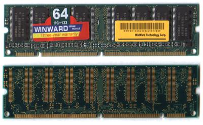 这次我们拿到的是盛怡最新PC133规范的金豹内存。从外表看上去,色彩斑斓,十分惹眼,在PCB板的左上角印有WINWARD(盛怡的标记)的字样,在内布条的右侧还有一个表示PCB板层数的数字,反过来,显示出是6层板。
