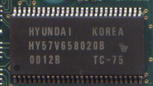 再将目光放到内存芯片上,我们可以看到金豹内存采用了编号为 HY57V658020B 0012B TC-75的芯片颗粒,这也是标准的PC133颗粒,工作速度是7.5ns的。“TC-75”其实指是的在CAS=3是TCK不大于7.5ns。