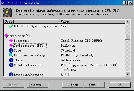 98,一切正常,根本没有感觉到像是在超频,于是我接着将外频设为 143MHz,这时,CPU主频达到了858MHz,进行Win 98!OK!一切正常。我一下胆子大了,将外频设为153MHz,这时开机显示为915MHz!我的心砰砰砰的直跳……,可惜Win