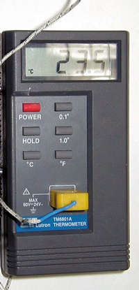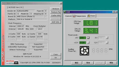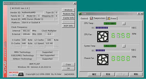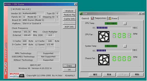 安装CPU DIE面温感器: 因为广大网友对CPU温度的测试有各种方法,测试颇有争议,故此本次测 试完全抛除软件及计算机主板的自测温,用目前比较先进的、纯物理的 温度测温器直接测试能接触到的CPU最热的DIE侧面。 环境温度22.8度,风扇转速7031转,测试软件WIN98、WCPUID、CPU USDM、SUPER P∏ 测试步骤: 1、首先我们把电压跳到默认状态,从600-950都能正常的运行,运行 QUAKE3 半小时也十分正常,奇怪的是毒龙600的默认电压是1.6V,而磐英BIOS默 认1.65V。 2、在1.65V,超到1.00 GHZ,计算机不能点亮。我们以每0.05V增加电压, 在1.80V计算机成功点亮,而且运行QUAKE 3半小时完全正常。磐英BIOS显示电压1.81V。 3、太激动了,我们又开始冒着“心脏”被烧毁的危险,不顾一切的往上 超。在1.89V,我们点亮了1.05 GHZ,可惜WIN98启动失败。 4、然后我们又直接把倍频跳到11倍,试图在1.10 GHZ有所作为,可是在1.80V-1.90V都失败了,我们估计是CPU温度太高, 测温器的温度都快接近75度了,后决定让CPU休息20分钟,从最低的电压 开始测试。终于在1.70V点亮计算机,很不幸连BIOS都进不去就死机了, 测了几次都是同样的结果。值得探讨的是为什么只有在1.70V才能亮机。 5、受到1.10 GHZ的鼓舞,我们继续向1.15 GHZ、1.20 GHZ亡命冲击,折腾 近40分钟,无功而返。然后又只能回到1.00 GHZ,继续享受着高速QUAKE 3 爆爽的快感......