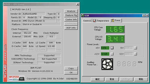 后记:我们又找来几块不同生产时间和不同生产线的Duron 600 MHZ CPU,怎么试都达不到以上的效果。继续又换了各种CPU散热器,包 括FOXCONN PK889,也没有上述的表现。 结论:超频Duron首先要找对CPU,可不要找那些“先天不足”的,然后 要有一个良好的散热利器,PK925真因该值得称赞,他与Duron的配合真 是完美无缺,6500转的标称转速,加上底面有块2.5毫米厚的铜片,使得 CPU的热量迅速的散发,是目前国内所能购买到的最佳散热器。我们认为 毒龙600超950因该最好,DIE表面温度比1.00 GHZ要低约10度,而CPU计算速度大概只慢1.5%,玩QUAKE 3没有速度的 差别。我们还发现一个有趣的现象,如果测温器的温度在WIN98启动当中 ,最高温度如果超过67度一定死机,这点还有待广大网友多多考证。