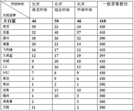 从表中我们可以清楚看到,大白鲨系列光驱是目前最受欢迎的品牌,其次才是宏基、源兴等。至于大白鲨光驱为什么有如此多销售商,真让人感到新奇。是利润很高吗?不是!是厂家直接租赁的柜台吗?更不是!那又是为什么呢?--这正是我们上文提到的:经销商总喜欢卖那些受用户欢迎,而且性能极其过硬的光驱,这样才能保证信誉和业绩。