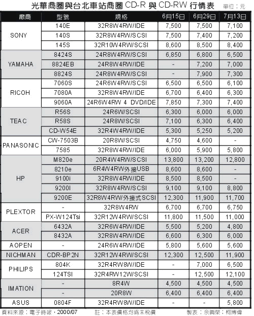 另外近两周集中商圈的刻录盘片售价变动情况也有趋缓现象,不过由于正逢暑期市场的销售热潮,部份门市对于百片以上桶装的价格,还是有较大的议价空间。