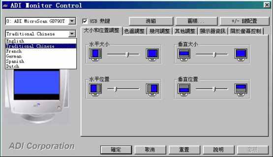 ADI的USB HUB型号为UH--200,它既可以单独放置,也能够通过两侧的塑料卡子固定在底座的后部,不需要外接电源,由此向显示器传送控制信号,另外获得USB HUB所需的电能。而其被称做"视控精灵"的控制软件有着很高的设计水平,功能强大丰富并易于使用。下面让我们看看小精灵是如何让你动动鼠标就实现对显示器的控制的。