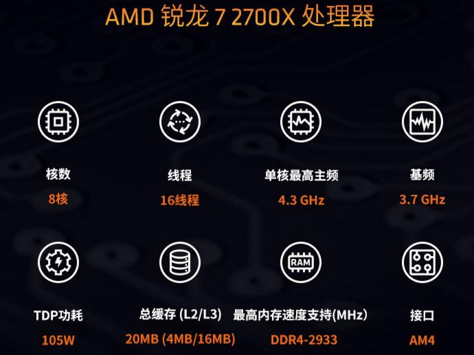 对于如此给力的处理器来说,锐龙7 2700X在性能参数上肯定相当优秀,这款处理器是8核心16线程设计,在核心与线程数量如此多的情况下,用户在使用制作视频、渲染图像及绘图等应用软件时能做到画面流畅,同时在进行大型游戏时也能保持稳定的帧数。基础频率3.7GHz,单核最高频率4.3GHz,并且锐龙72700X处理器还可以随时超频,让用户释放出CPU的全部性能,感受强风一样的性能冲击。16MB的L3缓存,TDP105W,相信性能十分给力的处理器在功耗上是如此之低,可以说这对性能也有不小的提升。除此之外,锐龙7 2700X还配备了冷却效果显著的全新幽灵Prism散热器,并且自带LED RGB灯,对于热衷于DIY的用户来说十分炫酷,还等什么,赶快入手把这款处理器带回家!