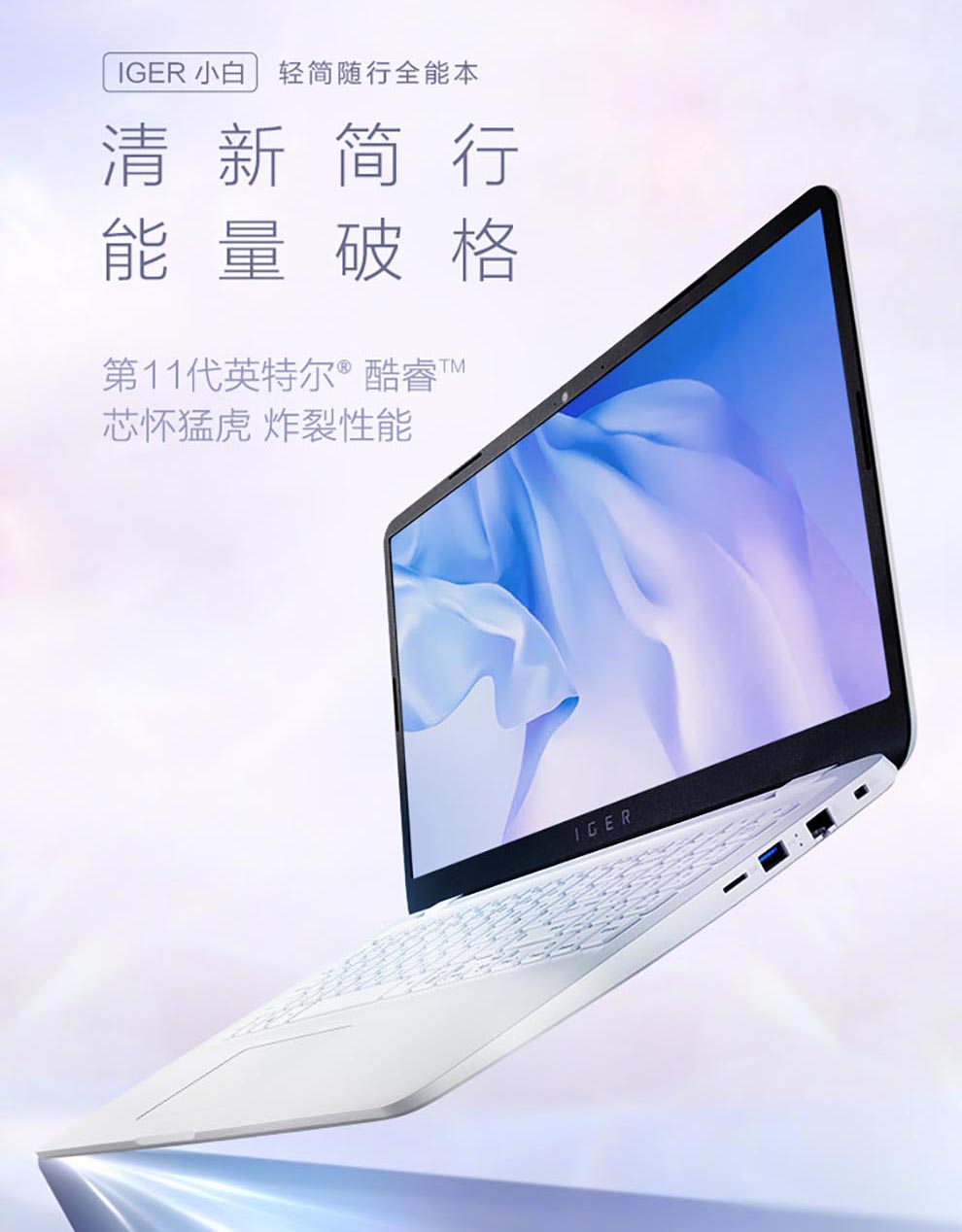 8月5日,雷神正式发布新款 IGER小白轻薄本。采用纯白外壳,侧面楔形设计,最厚处仅为19.95mm,轻至1.85kg。采用15.6英寸窄边框IPS屏幕,分辨率1080P。具有全尺寸键盘,加宽空格键的设计实现更高效输入,同时有着完整数字小键盘区。搭载英特尔第11代酷睿Tiger Lake-U处理器,可选 i5-1135G7或i7-1165G7处理器,均为10nm制程工艺,睿频分别可达4.2GHz、4.7GHz。其中,i5-1135G7具有8MB L3缓存,Xe核显具有80EU;i7-1165G7多达12MB L3高速缓存、锐炬Xe核显拥有96EU。标配16GB DR4-3200双通道内存、512GB NVMe固态硬盘,拥有丰富的扩展接口、51Wh大容量电池,办公续航约为10小时。