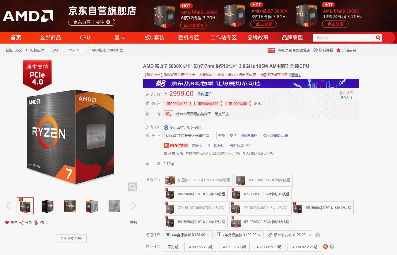 目前AMD锐龙7 5800X处理器在京东商城自营旗舰店的售价为2999元,同时享受白条分六期免息的优惠活动,近期来说绝对是好价了,想立刻畅玩《永劫无间》的朋友无需犹豫,直接入手吧!