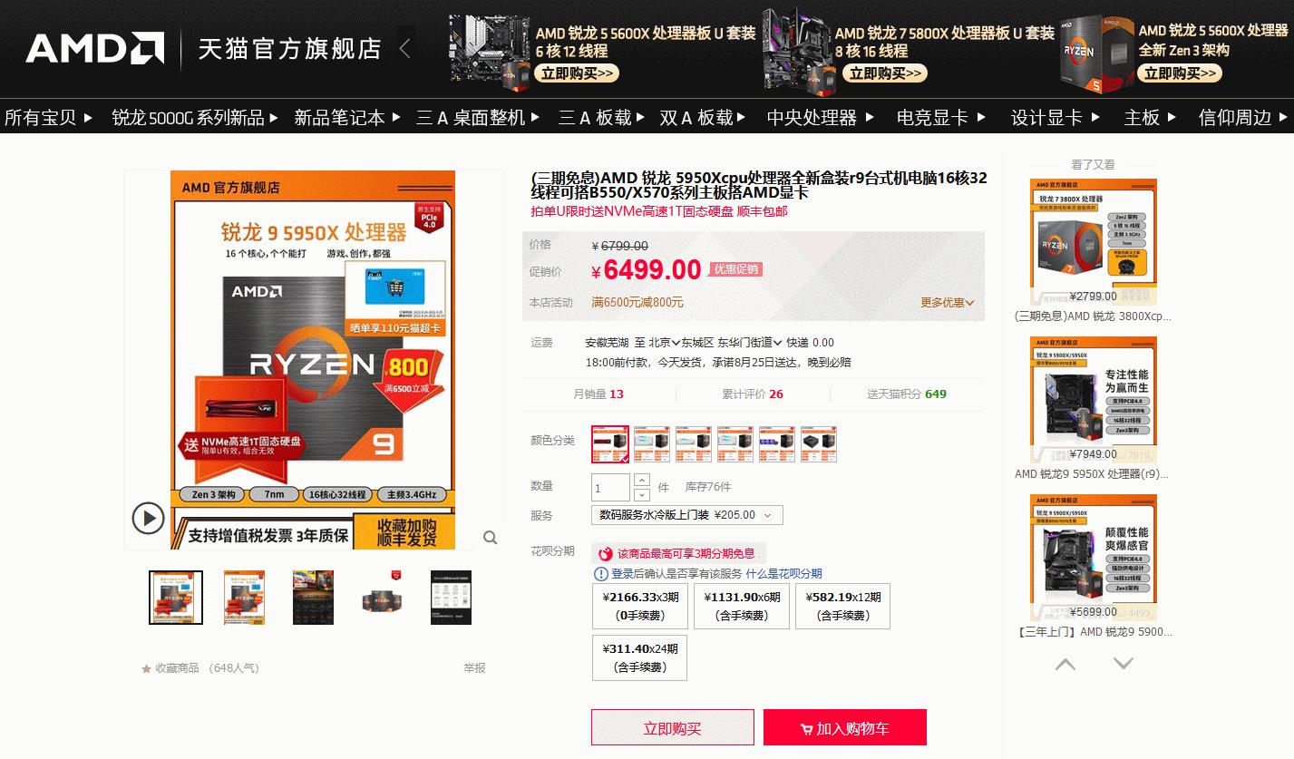 送SSD返猫超卡还免息 AMD锐龙9 5950X天猫好价推荐
