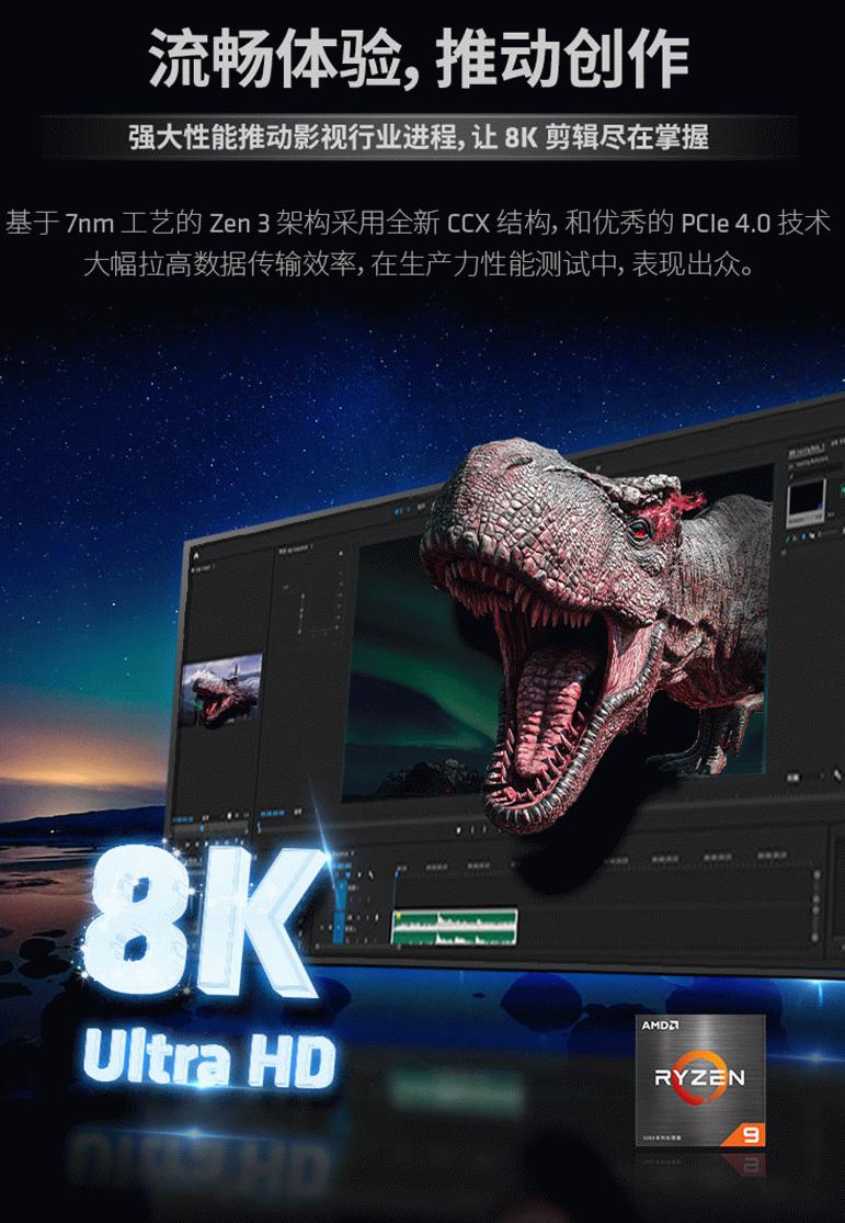 AMD锐龙9 5950X处理器优秀的CCX结构以及出色的单/多核性能,是推动影视行业进程的强大助力,让8K剪辑尽在掌握。即便同时运行多个大型生产力软件也毫无压力,让内容创造者灵感不断,效率倍增,从而获得最完美的体验。
