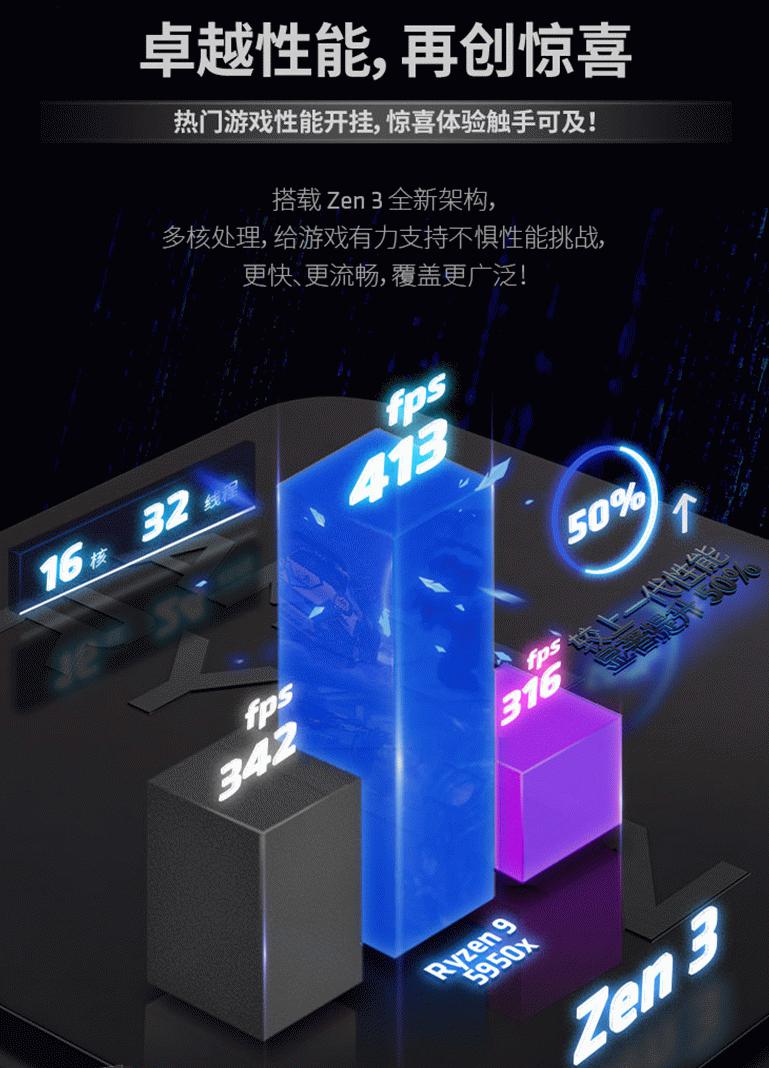 AMD锐龙9 5950X处理器在游戏表现上也毫不逊色,16核心32线程的高规格配置,让游戏时刻保持流畅运行的同时还可以拥有更多后台软件体验,而72MB的游戏高速缓存让您彻底告别卡顿掉帧,拥有极致的沉浸式游戏体验。