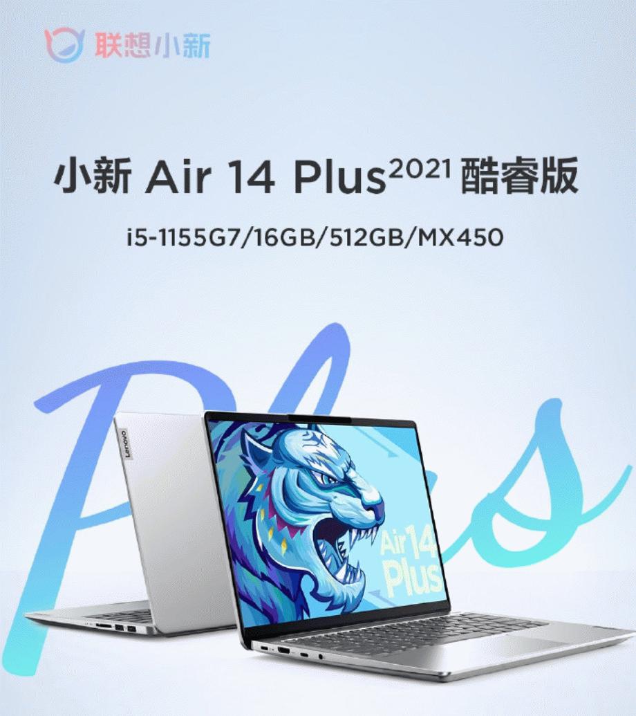 8月23日,联想推出小新Air 14 Plus 2021酷睿版,售价5499元。联想小新Air 14 Plus 2021酷睿版机身为纤薄金属材料,重约1.41kg,薄至15.9mm,支持开盖自动开机+人脸识别解锁。采用14英寸屏幕,分辨率达到2.2K级别(2240×1400),16:10比例,最高300nit亮度,100%sRGB高色域,硬件级低蓝光和DC无频闪调光,有效减少用眼疲劳。搭载全新i5-1155G7处理器,MX450独显,16GB内存+512GB SSD。内置56.5Wh大容量电池,提供65W适配器,支持PD快充。有全功能USB-C、标准HDMI接口与全尺寸SD读卡器。