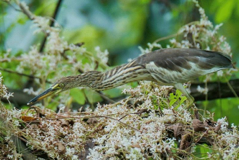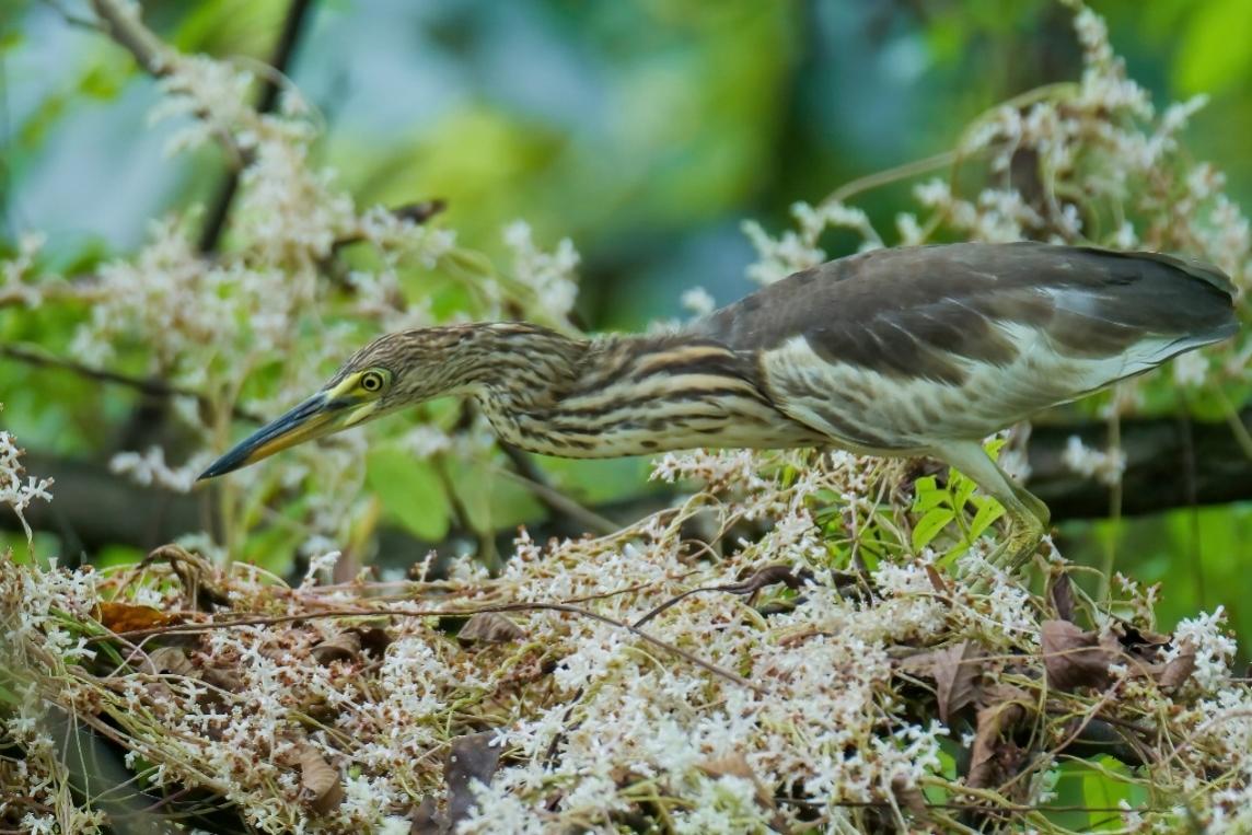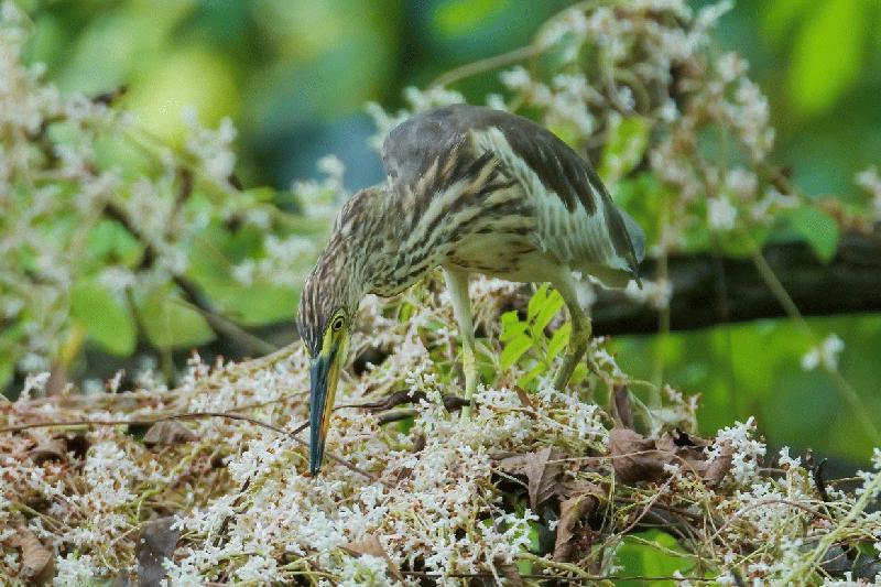 一只池鹭站在树上,藤蔓上的花开了,吸引了蜜蜂前来采蜜,于是池鹭出手了,连拍追焦三张。