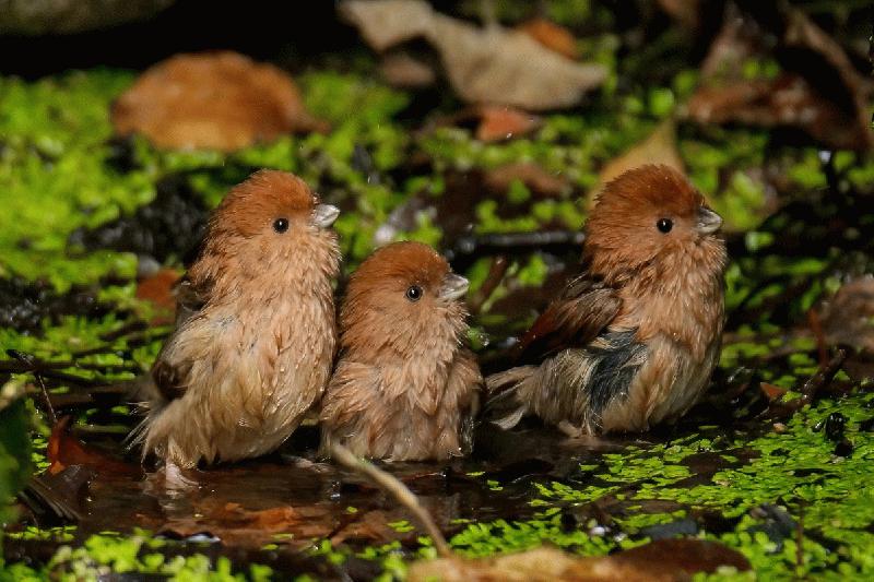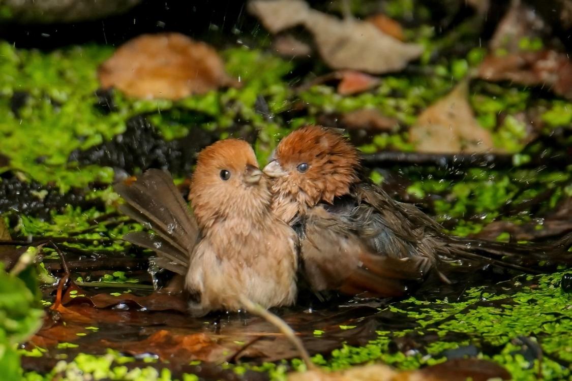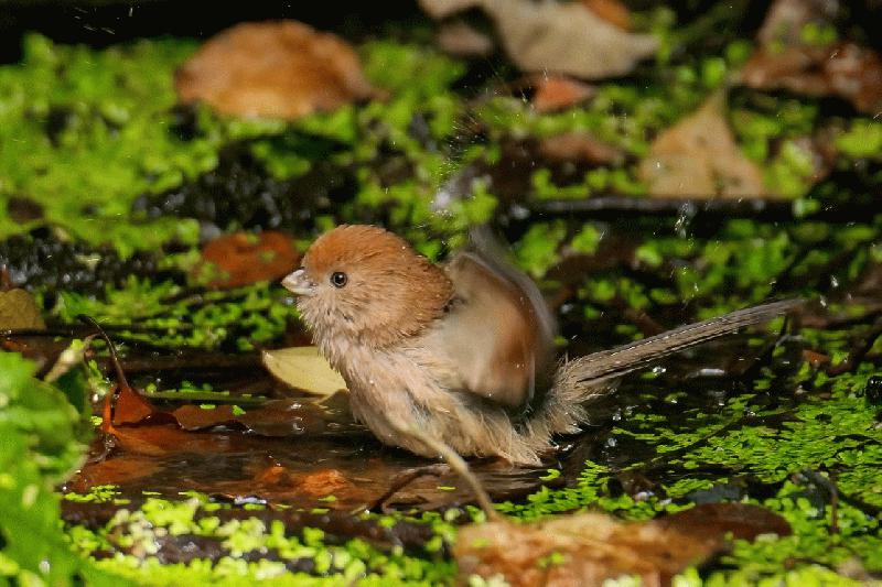 炎热的夏季,即使体型再小的鸟也忍不住会集体来小水塘洗澡,这不,棕头鸦雀们就结伴前来了。需要告知的是,G9的连拍声实在不是很响,仅够我这个拍摄者听见,让我得以在足够近的距离拍摄这个洗澡的场景。