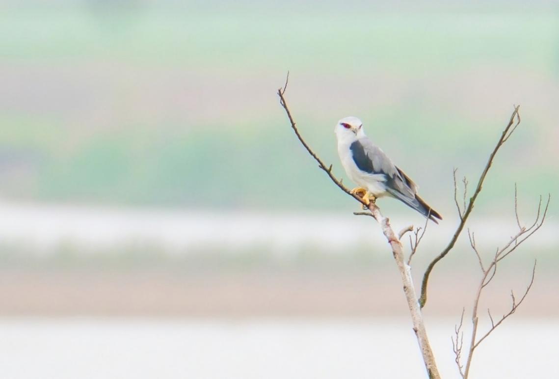近百米开外的树枝上停歇着一只黑翅鸢,后期裁剪后虽然没保留下多少细节,但是作为环境版的照片还是没有问题。