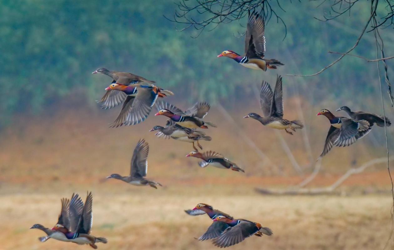 一群鸳鸯在水库里飞起,尽管在随着水浪颠簸的游艇上,我还是通过这套设备拍摄到了鸳鸯起飞的美丽瞬间。