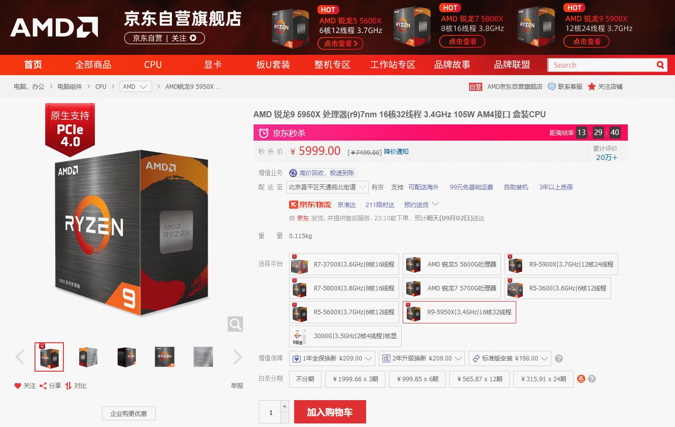 AMD锐龙9 5950X处理器目前在京东商城自营旗舰店的限时秒杀报价为5999元,同时享受白条分6期免息的活动,这样的优惠力度,DIY用户们完全可以直接入手了,想体验一下目前最强消费级处理器的性能吗?点击下方链接赶快下单吧!