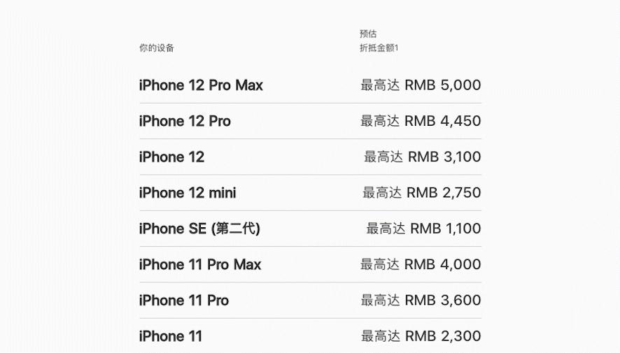 苹果中国官网现已将iPhone 12系列机型加入Apple Trade In换购计划。其中iPhone 12 mini、iPhone 12、iPhone 12 Pro、iPhone 12 Pro Max,四款机型预折抵金额最高分别为2750元、3100元、4450元、5000元。