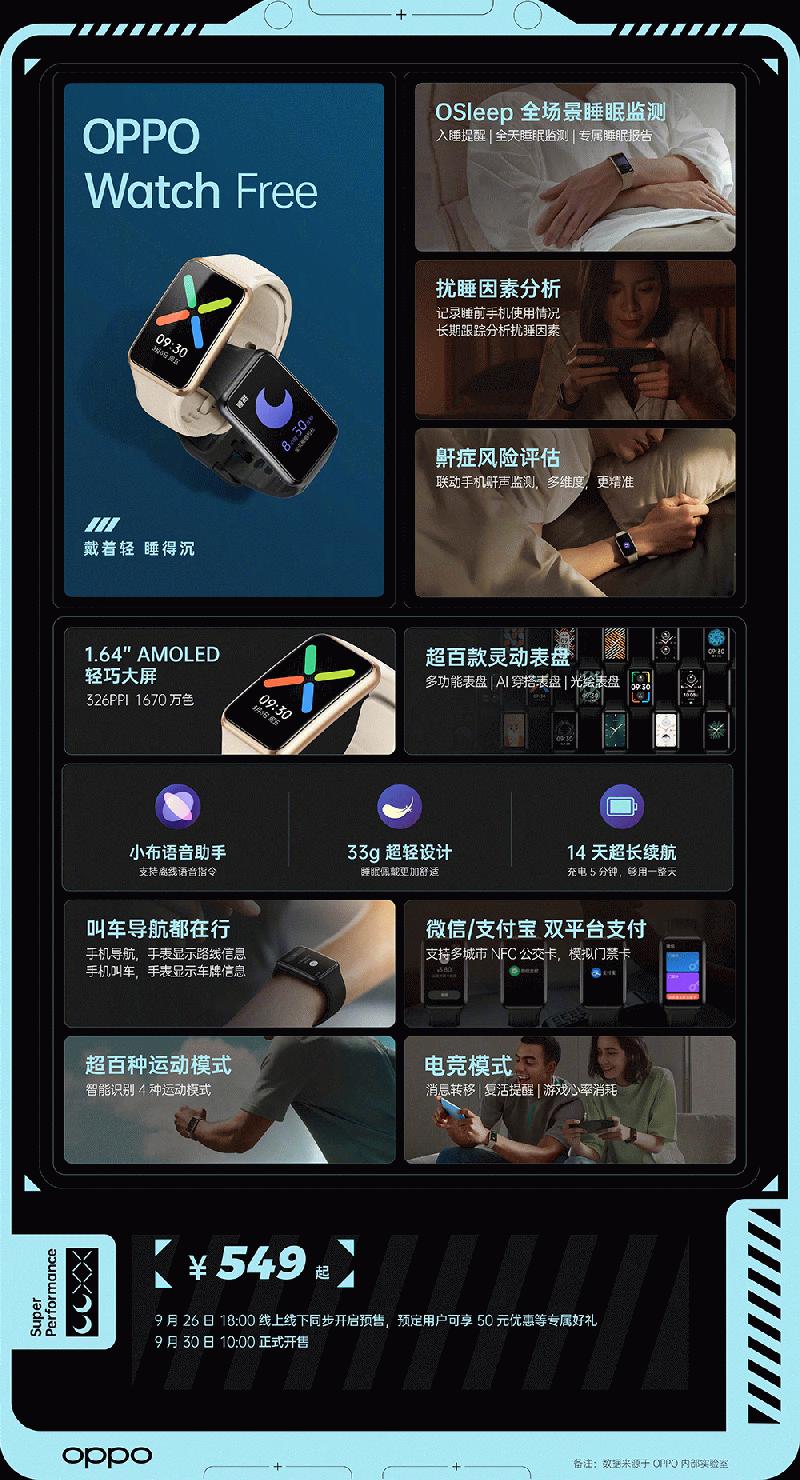 9月26日,OPPO推出了一款可穿戴设备——OPPO Watch Free。采用1.64英寸AMOLED大屏,PPI达到326。材质采用2.5D弧面耐刮玻璃,共有静夜黑和流沙金两种配色,整机重量仅有33g。表带采用定制皮纹质感表带,佩戴干爽透气。内置超百款表盘,支持AI穿搭表盘2.0,时尚表盘想换就换。