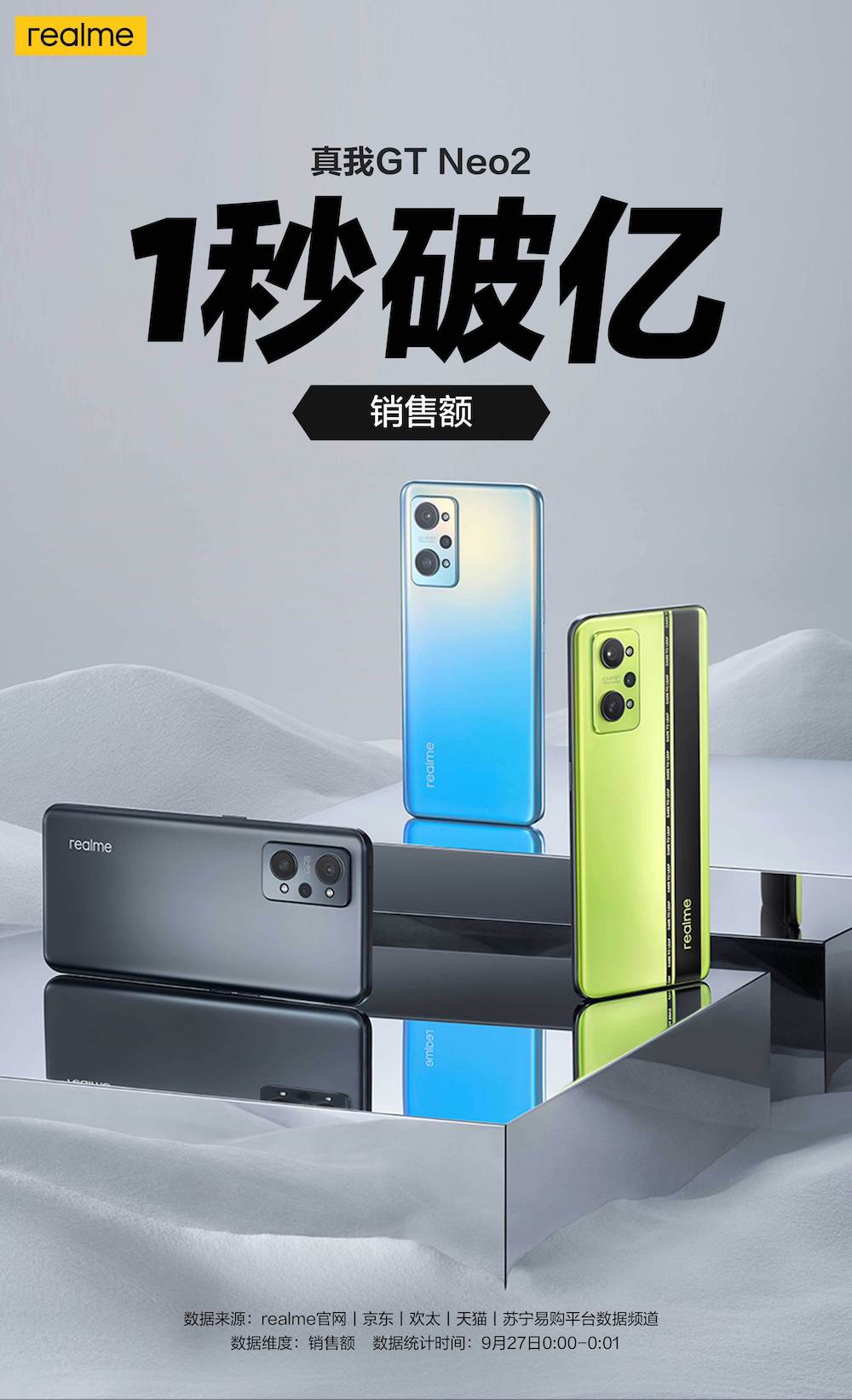 9月27日,realme公布了realme GT Neo2的首销战报:销售额1秒破亿。