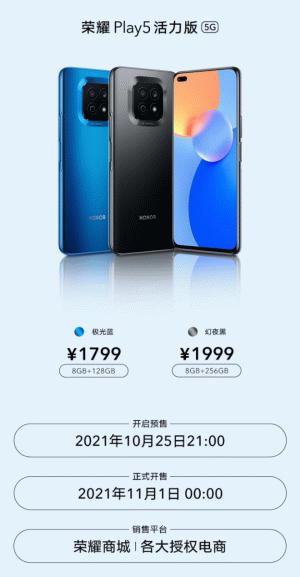 荣耀Play5 活力版10月25日21:00开启预售,11月1日0点在荣耀商城及各大授权电商平台正式开售。8GB+128GB版售价1799元,8GB+256GB版售价1999元,更多双十一惊喜活动,敬请持续关注。