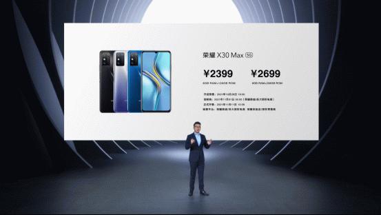 荣耀X30 Max提供幻夜黑、魅海蓝、钛空银三种配色可选,8GB+128GB版本2399元,8GB+256GB版本2699元。