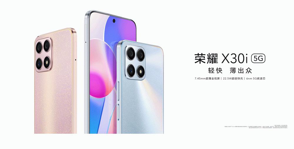11月5日,荣耀X30i迎来首销,提供6GB+128GB、8GB+128GB、8GB+256GB三种配置,售价分别为1399元、1699元、1899元。荣耀X30i的机身厚度仅为7.45mm,得益于此,荣耀X30i成为荣耀迄今为止最薄的5G手机。荣耀X30i使用多层聚氨酯复合超薄屏,低介电超薄PCB 电路板,实现了更加纤薄的机身表现。采用6.7英寸的超窄边全视屏,屏幕边框1.1mm,屏占比高达93.6%,支持90Hz高刷。搭载天玑810 5G芯片,内置4000mAh电池,支持 22.5W快充以及GPU Turbo X和Link Turbo X技术。后置4800万像素主摄+200万像素微距镜头+200 万像素人像虚化镜头的组合,主摄传感器尺寸为1/2 英寸。