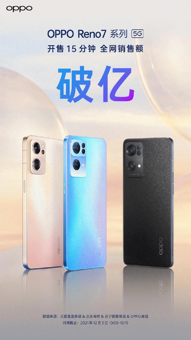 12月3日,OPPO Reno7、OPPO Reno7 Pro上市发售,起售价分别是2699元、3699元。官方公布的销售数据显示,OPPO Reno7、OPPO Reno7 Pro两款机型首销15分钟销售额破亿。