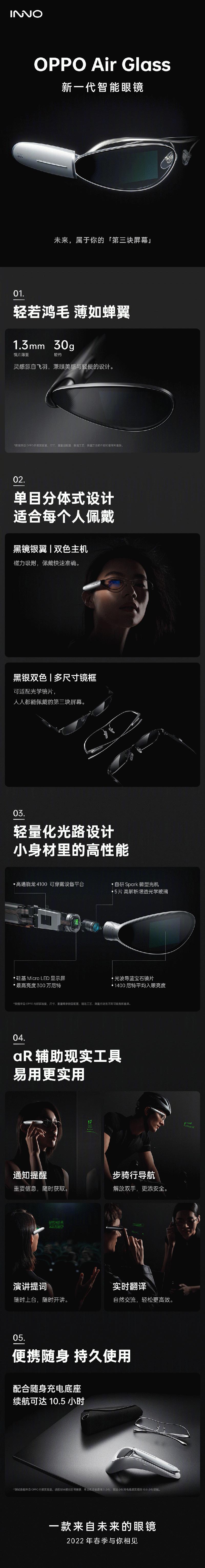 OPPOAir Glass开创性地采用单目分体式设计,在OPPO设计美学和轻量化设计理念下,以曲线的运用带来极致轻灵的设计感。眼镜整体重量不到30克,镜片厚度仅1.3毫米,是目前业界最轻的单目波导眼镜,用户在佩戴时的感受和佩戴墨镜一样,大幅减少使用时的“异物感”。