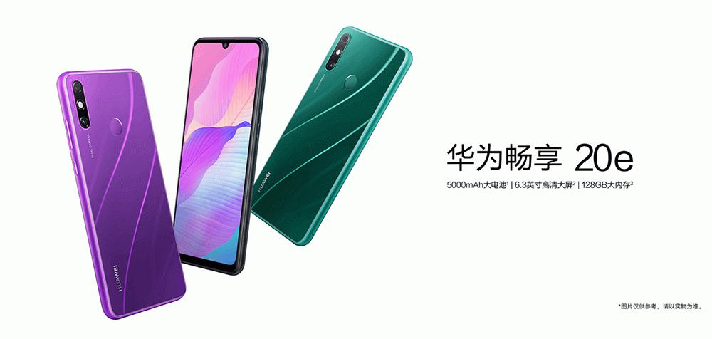1月6日,华为畅享20e高配版6GB+128GB正式开售,售价1399元。搭载麒麟710A处理器,由中芯国际代工,14nm工艺打造,属于麒麟710的降频版。采用S形全息纹理搭配双面2.5D玻璃机身,提供绮境森林、幻影紫、幻夜黑三种配色。配备6.3英寸HD+高清大屏,定制2.65mm小镜头。使用HarmonyOS 2系统,支持联通4G/3G/2G、移动4G/2G、电信4G网络。后置AI双摄,包括1300万像素高清主摄以及200万像素的景深虚化镜头,前置为800万像素摄像头,结合特置美肤方案可带来肌肤透亮、细腻动人的人像效果。内置5000mAh大容量电池,支持反向充电。在超级省电模式下,手机可自主关闭非常用的App和耗电进程,提升续航能力。