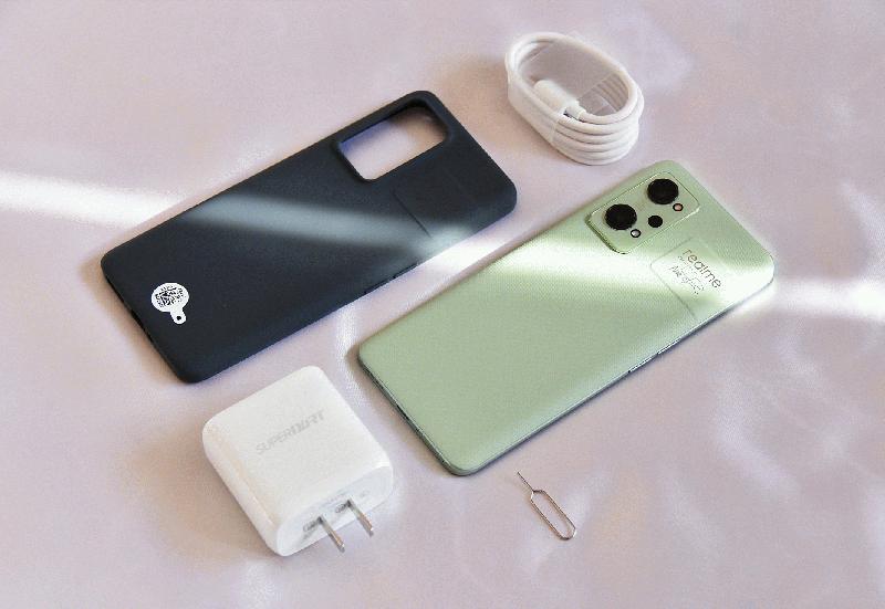 realme真我GT2开箱大合照,主机,原装保护壳,Type-C数据线,及适配器。