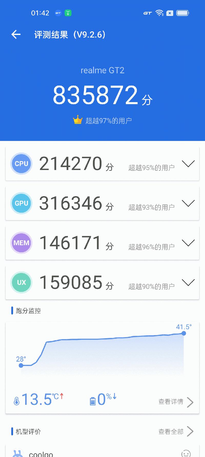 可以看到,安兔兔成绩达到了835872分,表现十分出色。日常使用毫无压力,开启GT模式下,性能满了大部分游戏需求,王者荣耀、和平精英等主流游戏开启最高特效下保持流畅运行。