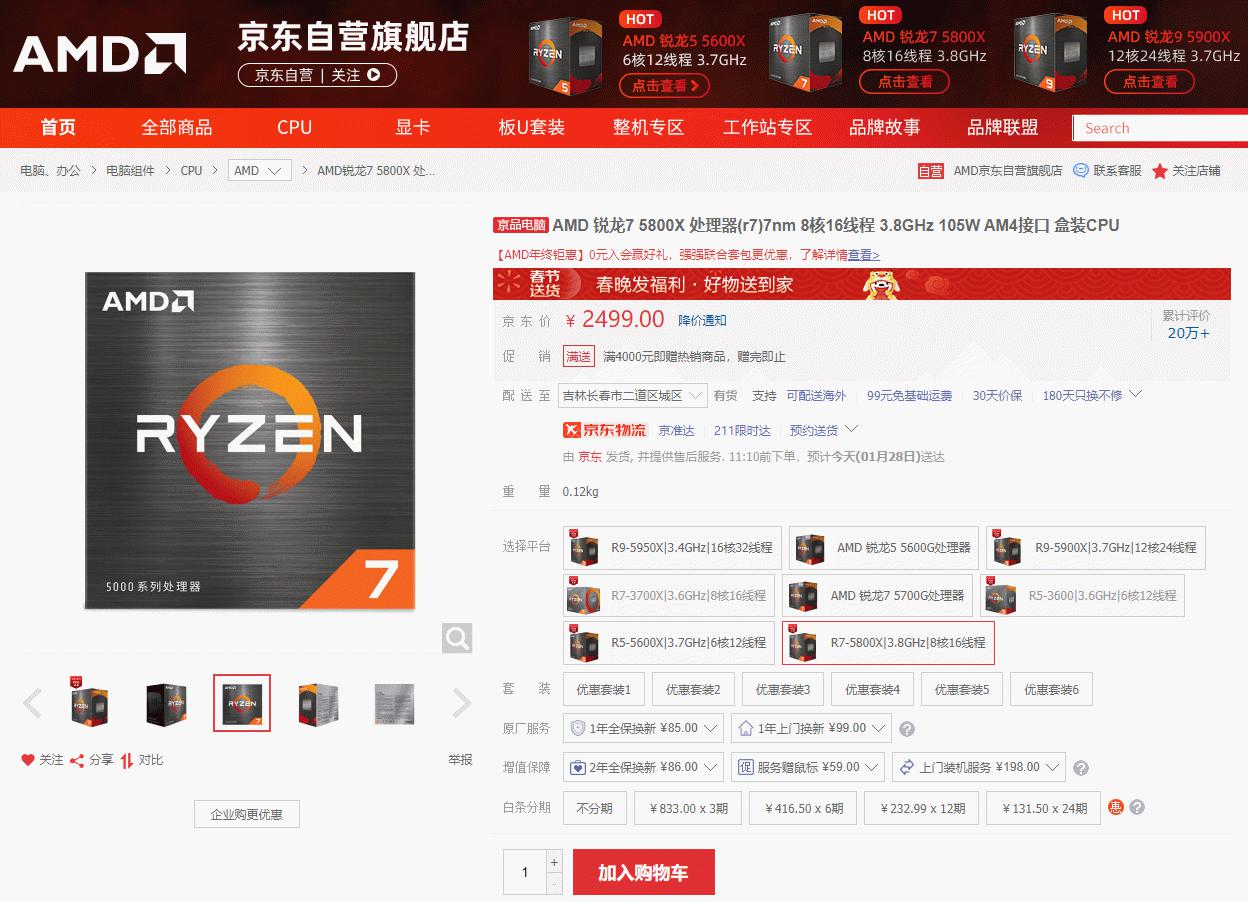目前AMD锐龙7 5800X处理器在京东商城自营旗舰店的售价为2499元,同时享受白条六期免息,想要在春节期间攒机的玩家朋友也可以放心下单,AMD京东自营旗舰店为您配送上门。