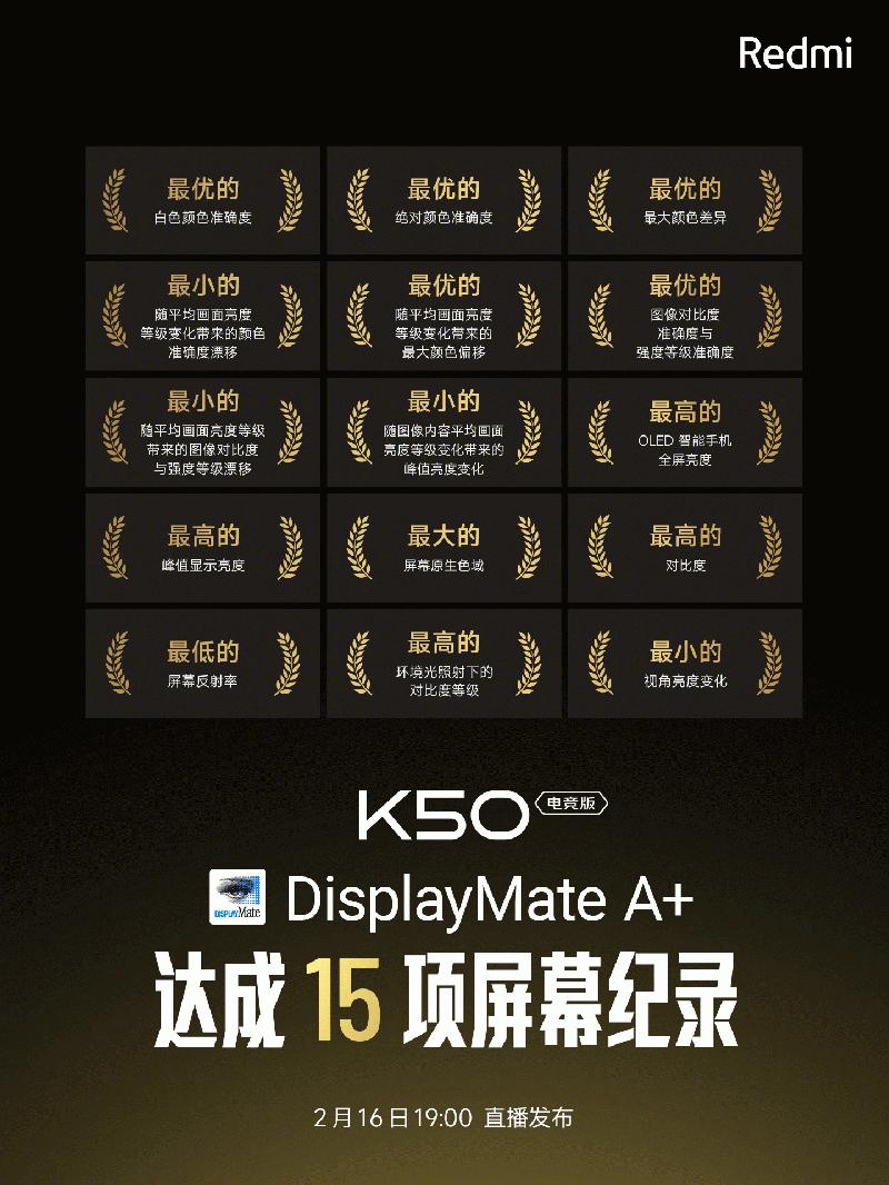 2月11日,Redmi红米手机对Redmi K50电竞版的屏幕进行了预热,称K50电竞版将配备一块OLED柔性直屏,获得了DisplayMateA+的评级,并且一次性创下了15项画质纪录。这15项纪录包括最高峰值显示亮度、最高对比度、最低屏幕反射率、最小视角亮度变化、最大的屏幕原生色域、最优的白色颜色准确度、最优的绝对颜色准确度、最高的OLED智能手机全屏亮度等等。K50电竞版的屏幕配备「原色屏」专业色准技,通过逐片调校,达成专业显示器般的精准色彩,JNCD≈0.18、ΔE≈0.30,两项表现均超出预期。K50电竞版还采用「Victus大猩猩®玻璃」保护,是康宁有史以来最坚固的大猩猩玻,抗摔提升1.5倍,通过2米跌落实,防划提升2倍,4倍于普通玻璃。