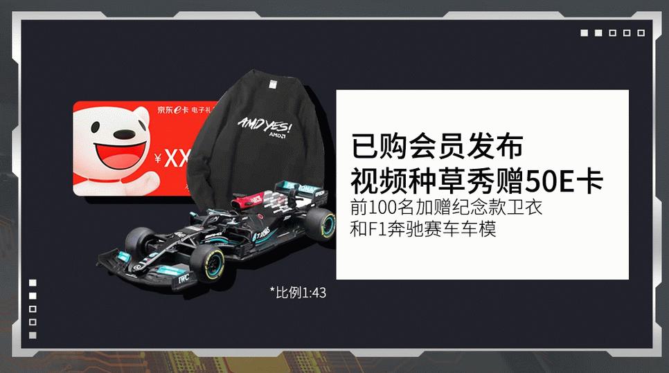 购买指定产品的用户可以在收到产品后发布相关的京东种草秀内容,前500名即可获赠价值50元的京东E卡,前100名还将额外加赠AMD YES纪念款卫衣和F1奔驰赛车车模一个。这样的福利活动大家千万不要错过啊。