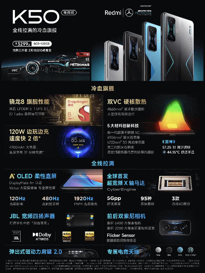 2月18日,Redmi K50电竞版迎来全渠道首销,提供8GB+128GB、12GB+128GB、12GB+256GB三款配置,售价分别为3299元、3599元、3899元。