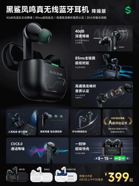 本次发布会黑鲨还为玩家带来了全新的黑鲨TWS蓝牙耳机 降噪版。基于国内首发全新的高通QCC3056芯片与高通Snapdragon Sound骁龙畅听技术,耳机可以提供24bit 96kHz采样率的高品质音乐,搭配12mm高品质动圈与专业金耳朵大师进行科学调音可为玩家提供身临其境的声学享受。高品质的声音表现只是基础,TWS蓝牙耳机 降噪版可为用户带来最高40dB降噪效果,并拥有全链路85ms超低的延迟表现,让玩家全面沉浸在游戏与音乐带来的美妙幻境中。
