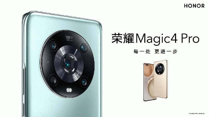 4月15日,荣耀Magic4 Pro在荣耀商城、各大授权电商及授权门店正式开启预售,5499元起。荣耀Magic4 Pro采用6.81英寸LTPO四曲面屏,对比度5000000:1,峰值最大亮度1000nit,屏幕分辨率为1312×2848,PPI 460,支持16K级亮度调节。搭载高通骁龙8移动平台,三星4nm工艺,全新设计的VC液冷系统,超薄VC设计,在保证散热效能的同时,为手机内部节省了更多空间。内置4600mAh容量电池,支持100W有线超级快充,大约30分钟即可充至100%的电量,还支持50W无线超级快充。后置镜头全面升级,由50MP主摄(7P镜头)、50MP超广角(1/2.5",122°)及64MP潜望式长焦(1/2",3.5倍光变,百倍数变,OIS+EIS)组成,还有额外8x8 dToF激光对焦传感器和Flicker传感器,实时记录深度信息,夜拍对焦更快更准。同时支持最新的多主摄融合计算摄影技术,荣耀自研HONOR Image Engine图像引擎、AI人像引擎、AI色彩引擎等自研技术,提高多场景下的拍照能力,色彩还原也更准确。