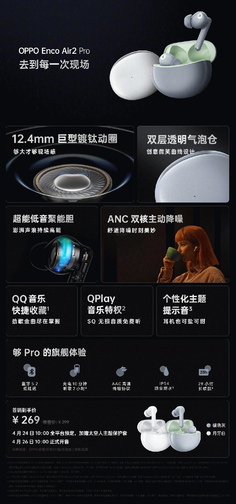 4月24日,OPPO推出新款TWS真无线蓝牙耳机——OPPO Enco Air2 Pro。采用双层透明气泡仓、创意微笑曲线设计,支持IP54防尘放水,有破晓灰、月牙白两种配色风格。集成12.4mm巨型镀钛动圈单元、超能低音聚能胆,支持双核主动降噪,特色功能方面有QQ音乐快捷收藏、Qplay音乐特权、个性化主题提示音。支持蓝牙5.2低延迟、AAC高清传输协议,续航28小时,充电10分钟可听歌2小时。