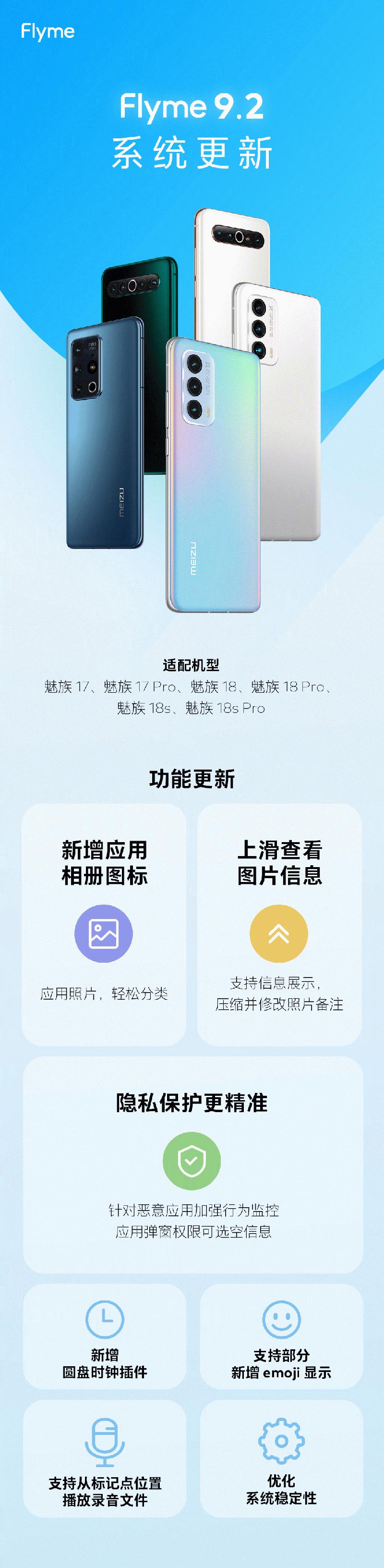 4月28日,魅族Flyme官方宣布,Flyme 9.2再次迎来更新,适配魅族17系列、魅族18和18s系列。在本次更新中,Flyme 9.2新增应用相册图标,应用照片分类更轻松;重构图库上滑联想功能,支持信息展示、压缩并修改照片备注;隐私保护更精准,加强了对恶意应用的行为监控;同时,还新增圆盘时钟插件、部分emoji显示及录音播放的升级。