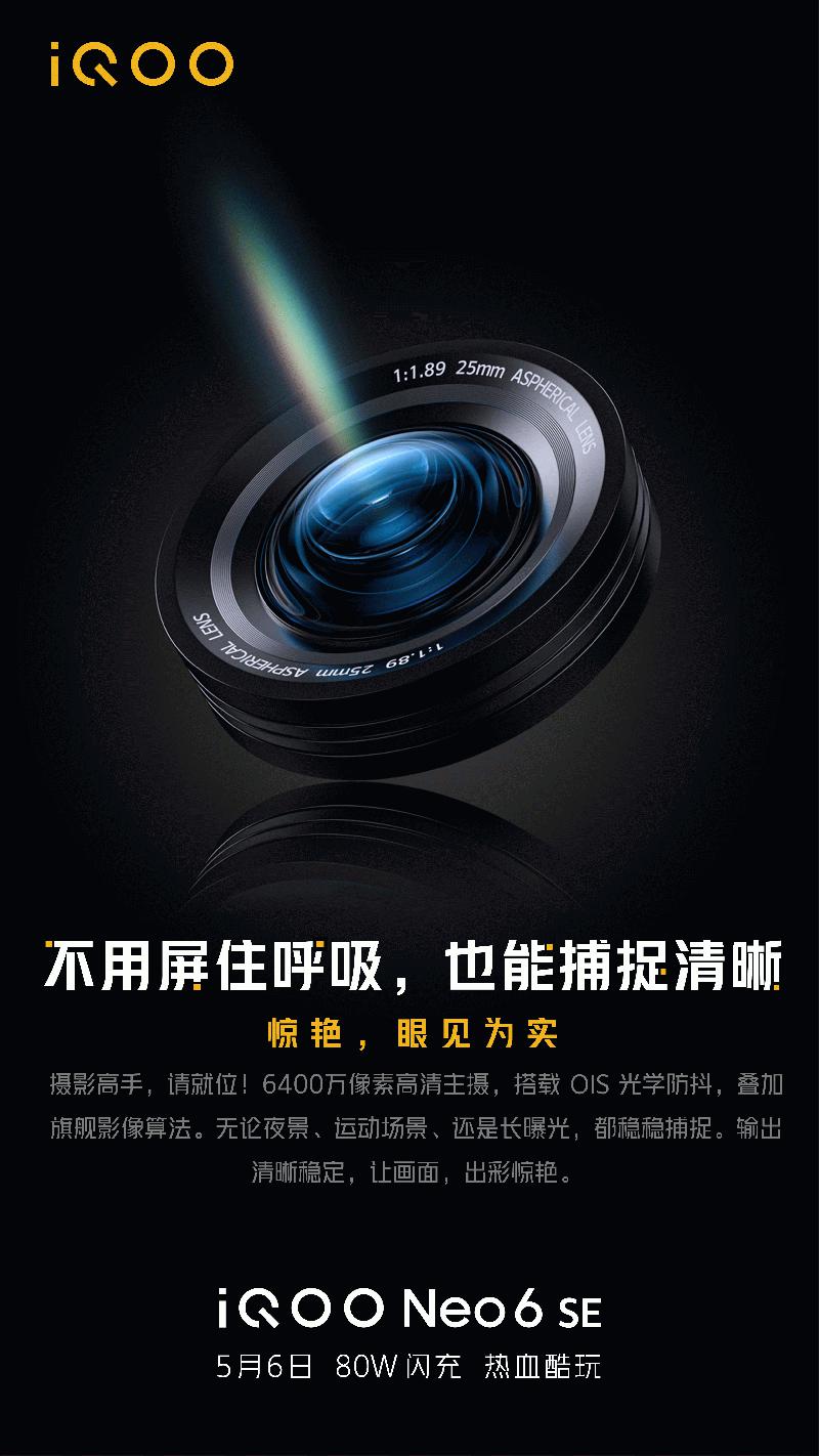 4月29日,iQOO官方宣布iQOO Neo 6 SE核心配置参数。将采用三星E4 OLED屏幕,局部峰值亮度1300nit,屏幕刷新率最高120Hz,瞬时触控采样率1200Hz。1200Hz瞬时触控采样率当前支持《王者荣耀》、《和平精英》、《穿越火线手游》、《使命召唤手游》以及《原神》共5款手游。iQOO Neo6 SE屏幕尺寸为6.62英寸,居中挖孔设计,拥有iQOO Neo6的10倍触控分辨率技术。搭载骁龙870移动平台,基于台积电7nm制造工艺,1个3.19GHz Cortex-A77+3个2.42GHz Cortex A77+4个1.8Hhz Cortex A55的八核心架构,GPU为670MHz的Areno650。同时iQOO Neo 6 SE配备超频版UFS 3.1闪存和UFS深度碎片整理2.0技术(仅256GB版本支持)。后置6400万像素高清主摄,OIS光学防抖,叠加旗舰影像算法,输出清晰稳定,画面出彩惊艳。