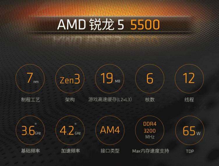 AMD 锐龙5 5500处理器采用了7nm制程工艺的Zen3架构,搭配6核心12线程的配置和最高4.2GHz的CPU频率。19MB的高速游戏缓存也很适合游戏玩家,锐龙5 5500处理器同样赠送AMD Wraith Stealth散热器,这样的性能配置相信对于预算只有不到千元的入门级游戏玩家来说绝对惊喜。