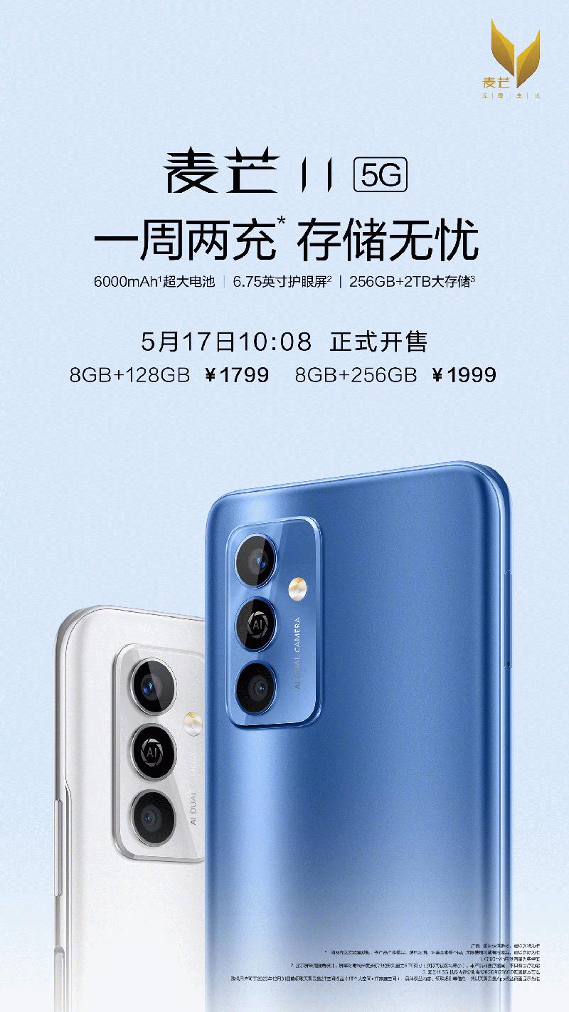 5月17日,中国电信麦芒11 5G开售,8GB+128GB、8GB+256GB售价分别为1799元和1999元。麦芒11采用6.75英寸超大显示屏,支持90Hz高刷新率,达到国家眼科工程中心护眼标准,结合智能调光、夜光屏等功能,缓解用眼疲劳。搭载7nm制程的八核5G芯片,8GB大运存,后置4800万像素AI双摄。内置6000mAh电池,官方宣称,配合AI节电技术,可达到一周两充,新机支持22.5W快充,充电10分钟可观影3小时。支持对手表、手环、手机等设备的12W反向充电(OTG)。