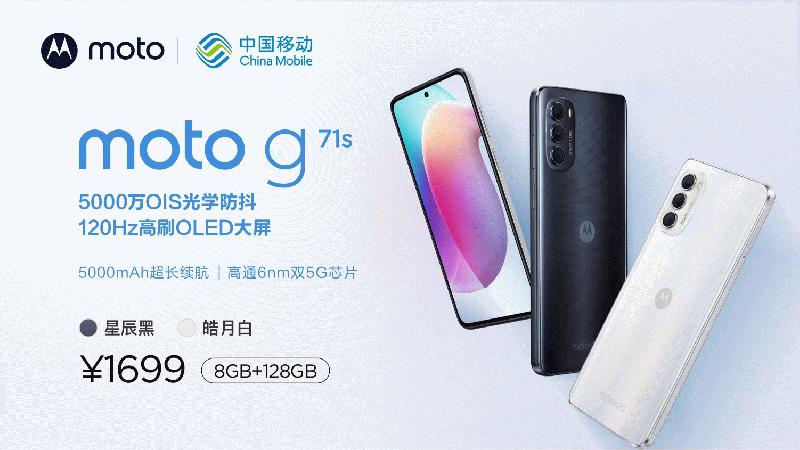 5月17日,摩托罗拉G71s正式发布。采用窄边框的6.6英寸OLED中空屏,屏占比91.3%,支持120Hz高刷新率,10亿色彩显示,全局DC调光,并通过SGS护眼双认证。搭载高通骁龙695 5G SoC,6nm制程工艺,CPU内核为Kryo 660,主频为2.2GHz;GPU是Adreno 619,主频840MHz,IPC架构性能表现和功耗优化等均有提升。整机7.99mm,内置5000mAh超大电池,33W快充,74分钟可补满电量。后置三摄,分别为5000万像素主摄、800万像素广角镜头、200万像素4cm微距镜头,其中主摄还支持同级别少有的OIS光学防抖和像素四合一。使用定制MYUI3.0系统,支持微信6开等。