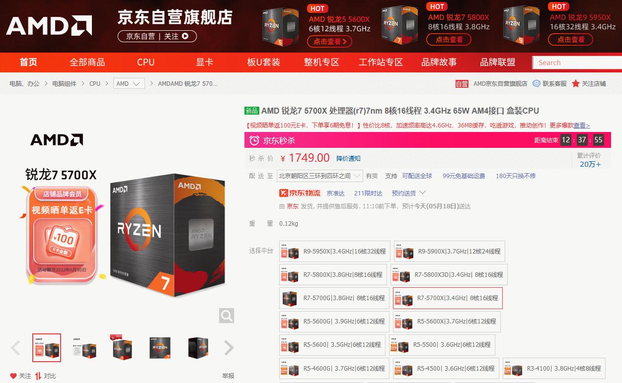 秒杀晒单返E卡 AMD锐龙7 5700X京东大促进行中