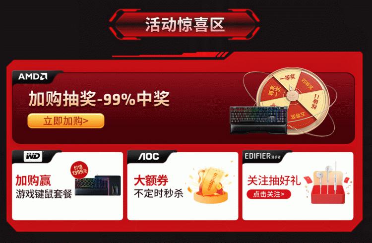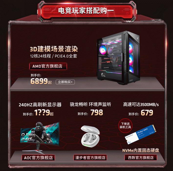 活动页面还贴心地为朋友们准备了电竞玩家搭配购的活动,AMD整机搭配AOC显示器和西部数据固态硬盘,再配上漫步者的耳机,这就是电竞玩家的必备产品了,一次购齐省时省力。