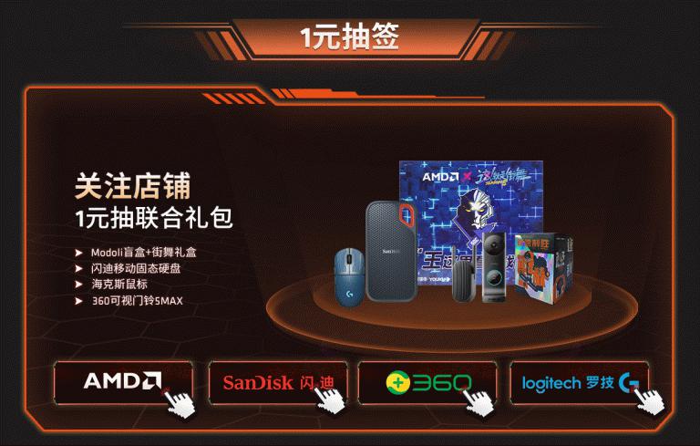 AMD天猫官方旗舰店的品牌联合活动属于第二次了,上一次的几个品牌联合活动已经结束,这次新活动的时间是6月1日到6月20日,AMD联合了闪迪、360和罗技继续宠粉,备受喜爱的1元抽联合礼包全新开启,只要关注上述品牌官方旗舰店,1元就能抽取联合礼包,里面包含了闪迪移动固态硬盘、罗技海克斯鼠标、360可视门铃5MAX和AMD Modoli盲盒好礼。