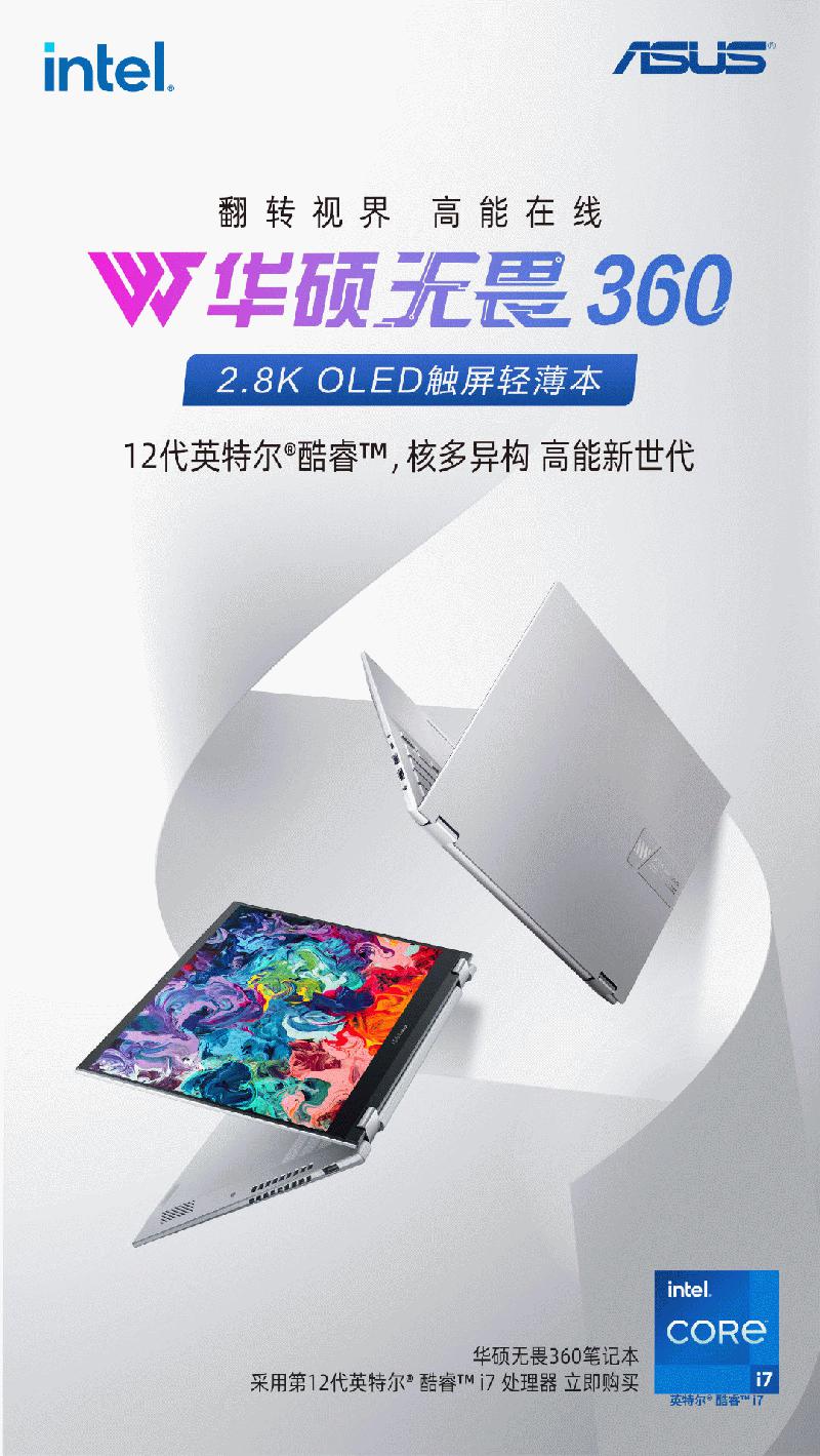 6月15日,华硕推出新款无畏360轻薄本,薄至16.9mm,重量约为1.5kg。采用14英寸2.8K 16:10 OLED屏,支持360度翻转,E4发光材质,600尼特亮度,100% DCI-P3色域,100万:1对比度,90Hz刷新率,0.2ms响应时间。搭载12代酷睿i7-12700H处理器,14核20线程,最高4.7GHz,45W TDP。内置双热管导热,大尺寸风扇。内存为8GB+8GB DDR4-3200,SSD为512GB PCIe 4.0。接口有雷电4、HDMI 2.0等。