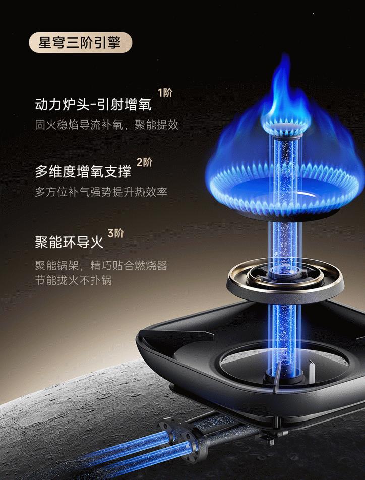 在解决净烟难题的同时,追觅在灶具方面也展现出技术雄心。星穹燃气灶搭载的“星穹多阶烈焰引擎”,借助“引射增氧技术”,重新诠释了中式烹饪的灵魂——“火候”。