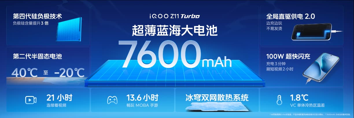 iQOO Z11 Turbo内置7600mAh超薄蓝海大电池,采用行业领先的第四代硅负极技术,能量密度达iQOO全系最高的860Wh/L,续航能力远超同尺寸性能机。配合100W超快闪充与全局直驱供电2.0技术,边玩边充不发烫、不伤电池,一杯咖啡的时间即可回血过半。